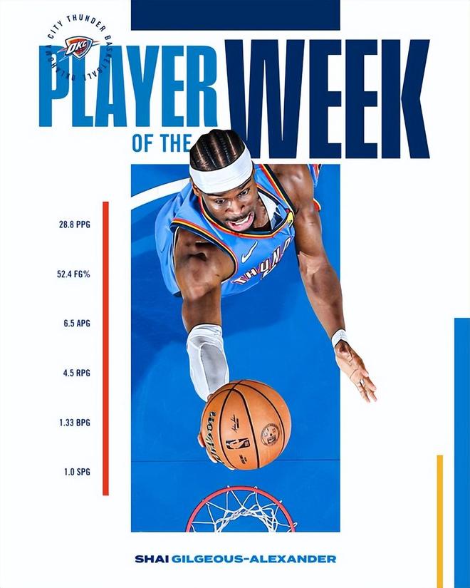 过去一周,亚历山大场均28.8分4.5篮板6.5助攻,投篮命中率52.4%,三分命中率31.6%,罚球命中率100%,率领雷霆取得4胜0负的战绩。
