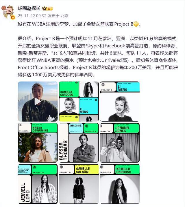 11月22日上午,李梦在社交平台发视频官宣加入Project B。视频中李梦表示,很荣幸加入Project B,也很荣幸能和世界上优秀的人们在一起,希望女篮人越来越好。