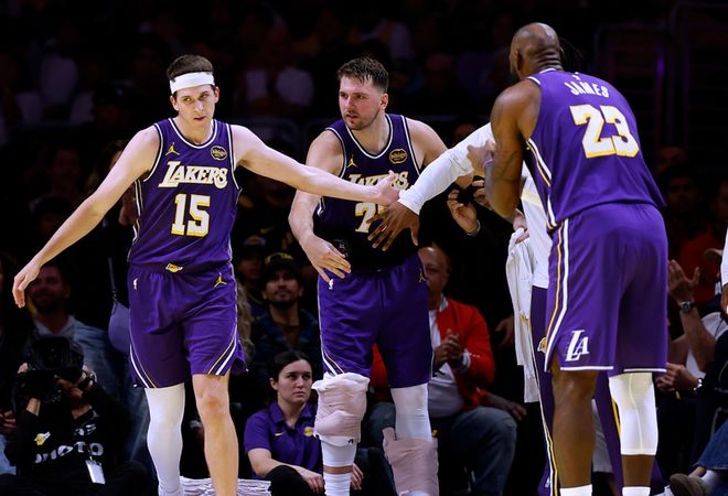 东契奇此战打了38分钟,28中14(三分12中7),11罚8中,砍下43分9板13助1断1帽,詹姆斯15中9(三分5中2),6罚5中,砍下25分6板6助1断1帽,里夫斯16中11(三分4中2),7罚7中,砍下31分9板3助3断,湖人三巨头合砍99分,威力太惊人。