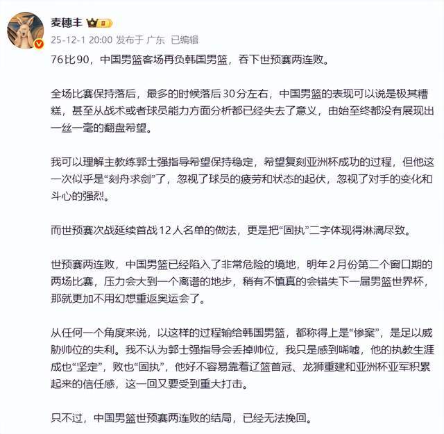 而广东媒体人麦穗丰老师,则直接怒斥教练席“固执”:“我可以理解主教练郭士强指导希望保持稳定,希望复刻亚洲杯成功的过程,但他这一次似乎是‘刻舟求剑’了,忽视了球员的疲劳和状态的起伏,忽视了对手的变化和斗心的强烈。而世预赛次战延续首战12人名单的做法,更是把‘固执’二字体现得淋漓尽致。”