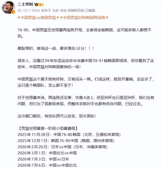 三土带刺老师更是直言“耻辱”:“最耻辱的,客场这一战,最多落后32分!很多人,没看过09年东亚运动会半决赛中国59-91输韩国那场球,但你看到了这些年,中国男篮对阵韩国最惨的一场!大家都想知道,到底是怎么了?