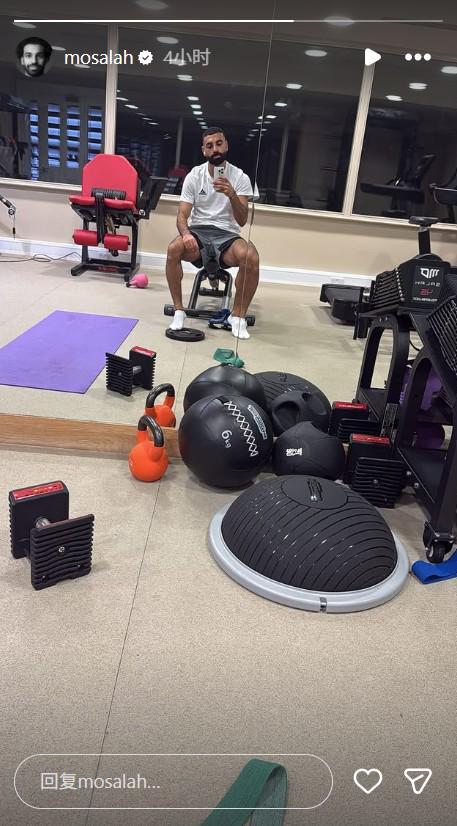 早些时候,利物浦球星萨拉赫在社交媒体上晒出了一张自己在健身房独自训练的自拍照,但没有配以任何文字。