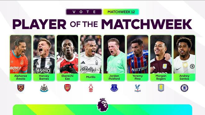 北京时间11月25日,英超官方公布了第12轮比赛的最佳球员候选,其中埃泽、安德雷-桑托斯、穆里略、哈维-巴恩斯、阿雷奥拉、摩根-罗杰斯、皮克福德、耶雷米-皮诺在列。