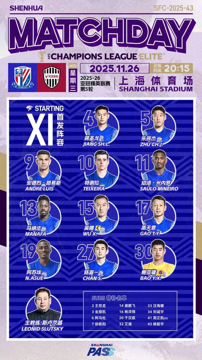 亚冠精英联赛东亚区第5轮,上海申花主场迎战神户胜利船。上半场,阿苏埃击中横梁,井手口阳介、山川哲史先后建功为客队取得2球领先;易边再战,安德烈和米内罗的进球先后因越位和犯规在先被吹,安德烈罚丢点球。最终,上海申花主场0比2不敌神户胜利船,遭遇亚冠两连败。